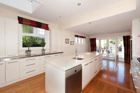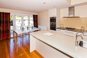 The modern kitchen is open plan with casual everyday dining which flows through French doors to the deck and secure garden.