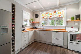 The modernised kitchen adds a contemporary touch in the culinary department while lead-lights, log-burner, bay windows and battened/sculpted ceilings and deep-grained timber floors nod in homage to original heritage.